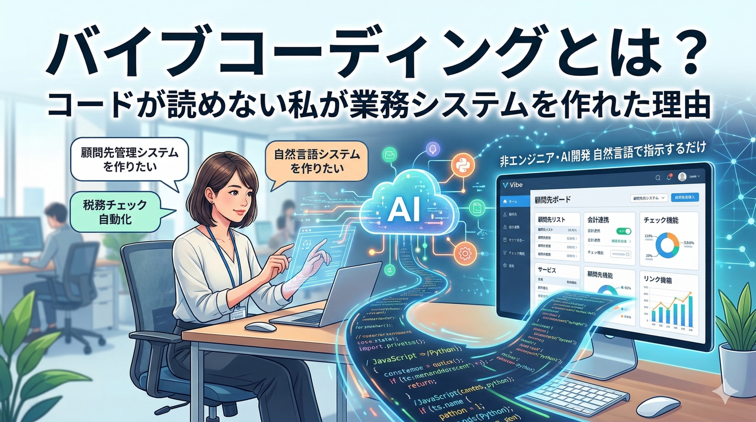 バイブコーディング バイブコーディングとは?コードが読めない私が業務システムを作れた理由 バイブコーディングとは、AIに自然言語で指示して開発する手法。プログラミング未経験の筆者が業務システムを構築した体験から、仕組み・メリット・限界を正直に解説します。 2026.03.07 バイブコーディング